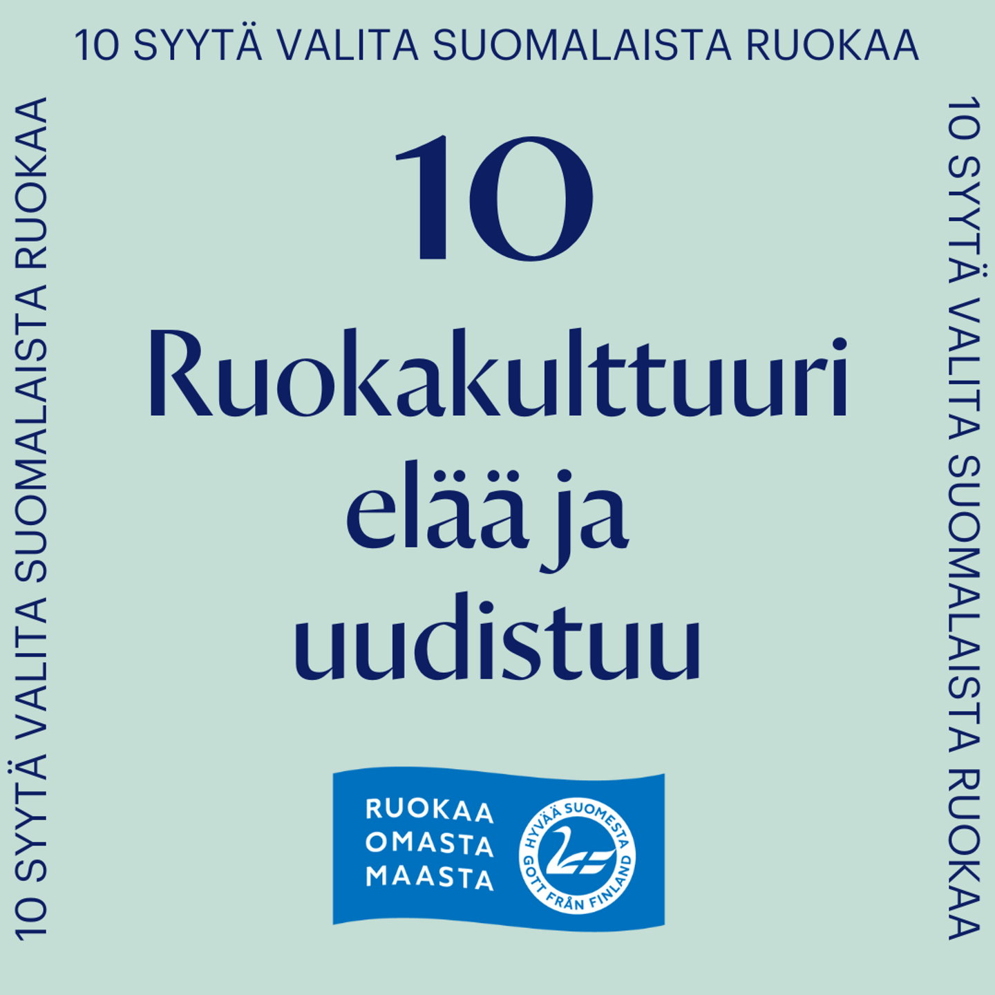 Ruokakulttuuriimme kuuluvat perinteet ja paikallisuus, mutta samalla myös uudet maut ja vaikutteet. Muokkaamme joka päivä ruokakulttuuria valinnoillamme. Ruokakulttuuri onkin alati muuttuvaa ja kehittyvää. Suomessa on paljon paikallisia erikoisuuksia, joita vaalimme, mutta toisaalta omaksumme innokkaasti uusia makuja maailmalta. Suomalainen ruoka-ala pitää huolta siitä, että ruokaa löytyy uutuuksista nauttivalle ja perinteiden kunnioittajalle, ja tietenkin kaikille siltä väliltä. Suomalaisista raaka-aineista valmistuu niin rössypottu kuin pizzakin.