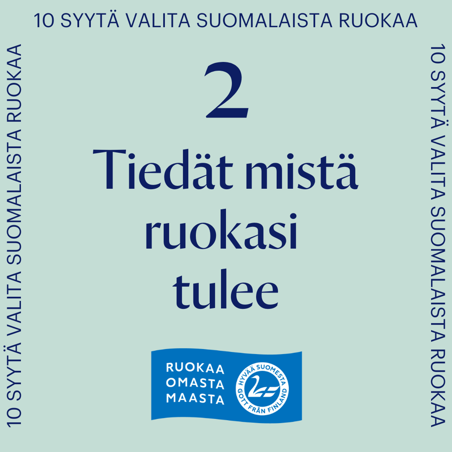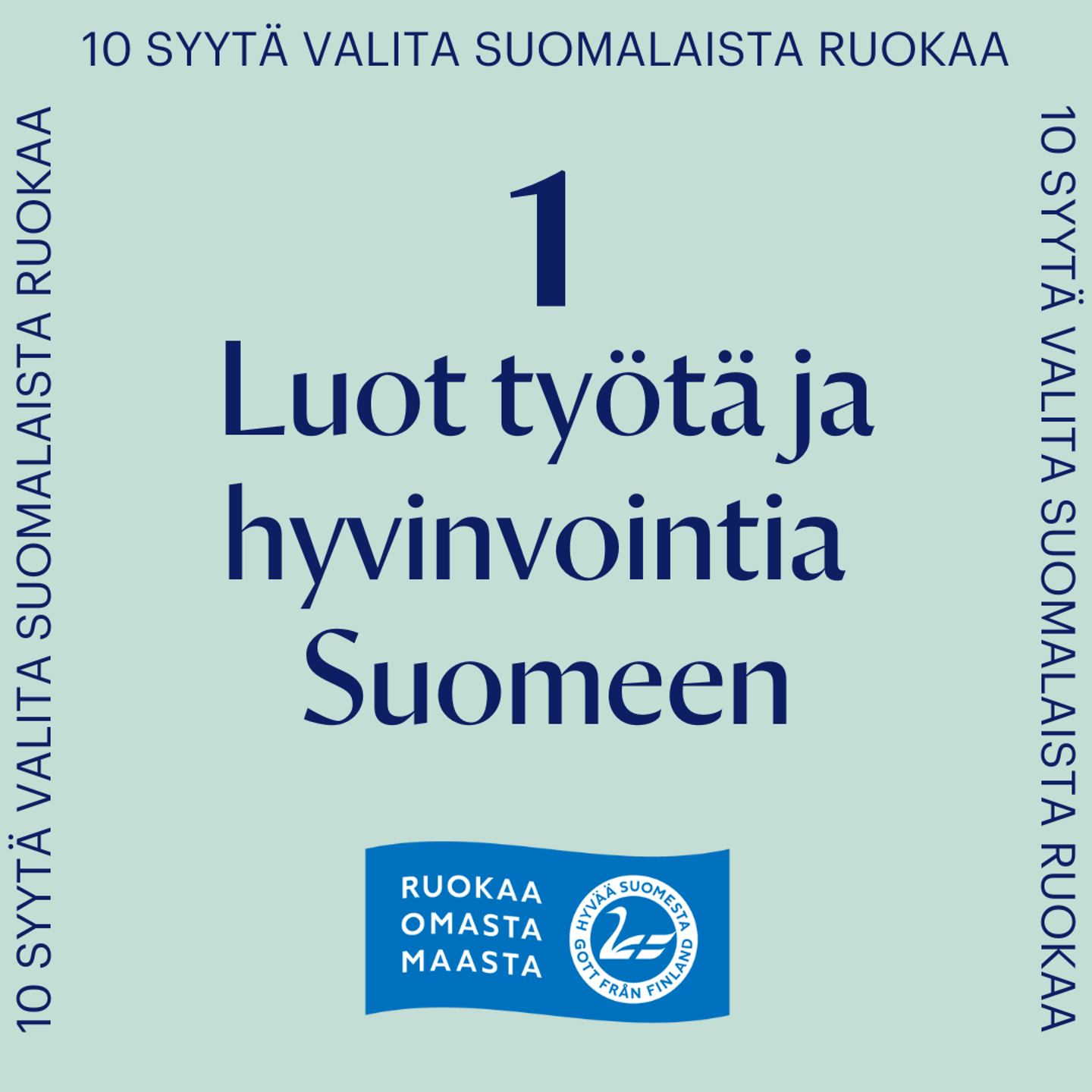 Valitsemalla ostoskoriisi suomalaista ruokaa parannat oman alueesi ja koko maan elinvoimaa ja taloutta. Ruoka-ala on tärkeä työllistäjä, sillä siellä työskentelee 12 % työllisistä, eli 320 000 henkeä. Kotimaisten ja paikallisten tuotteiden valinta tukee suomalaista maataloutta ja elintarviketeollisuutta sekä lähi- ja pientuotantoa. Näin myös verorahat jäävät kotimaahan meidän kaikkien hyödyksi ja hyvinvoinniksi.