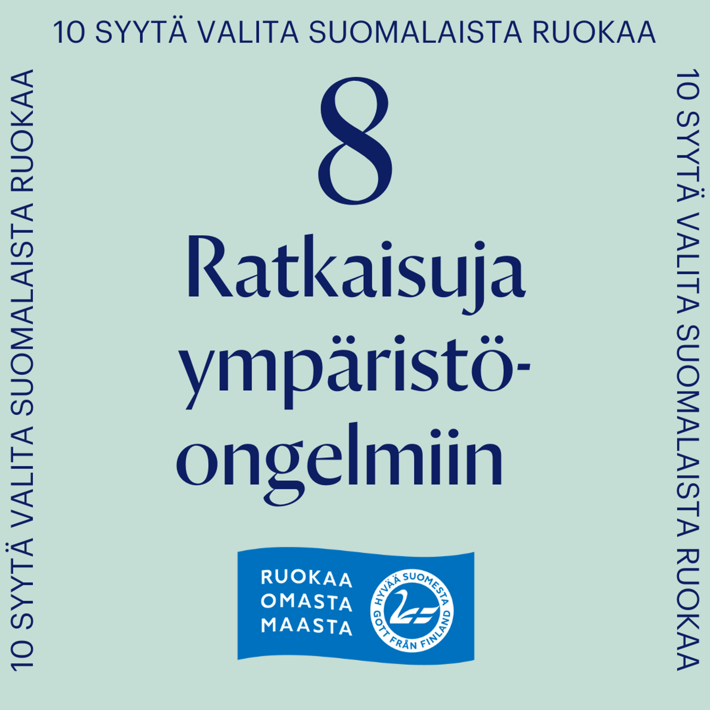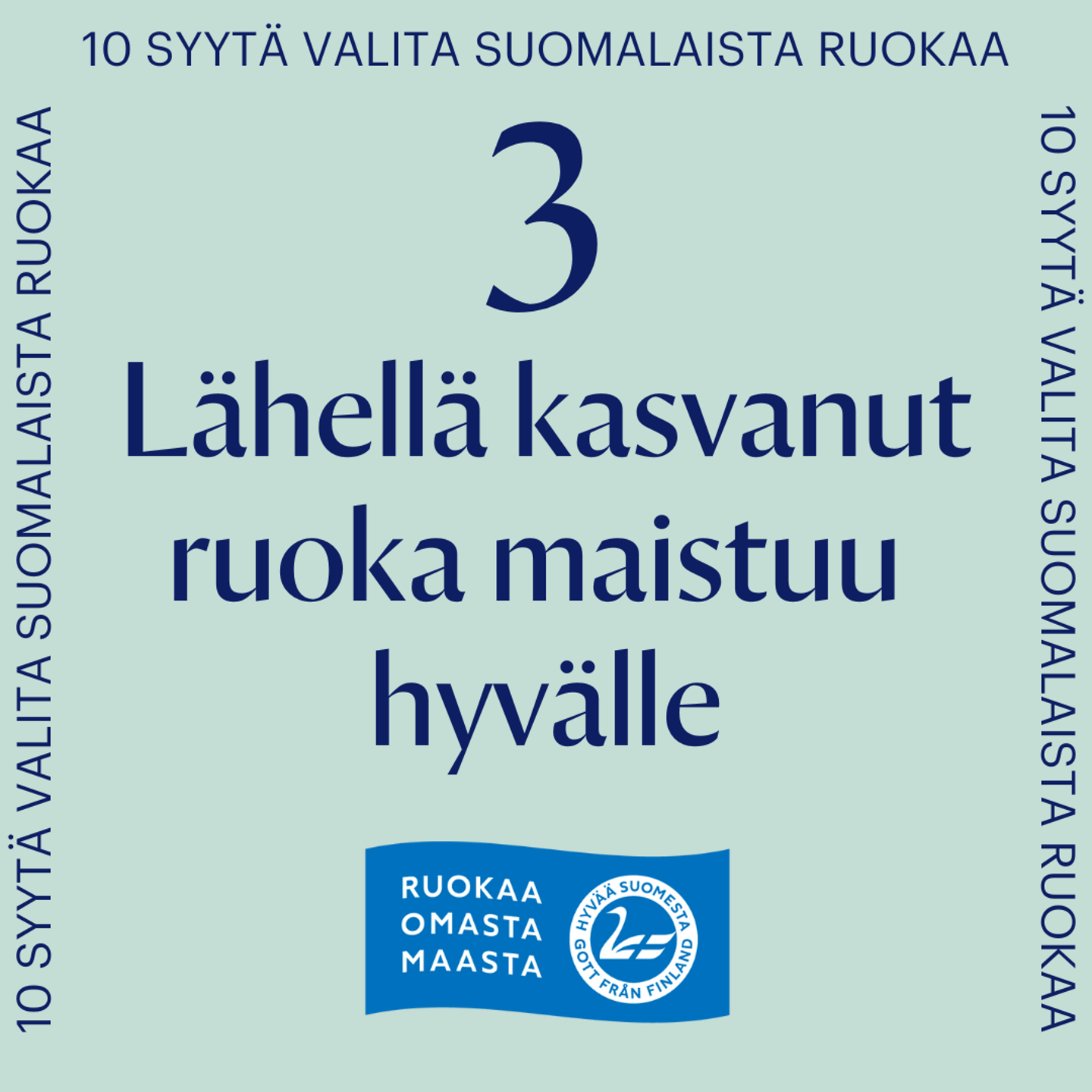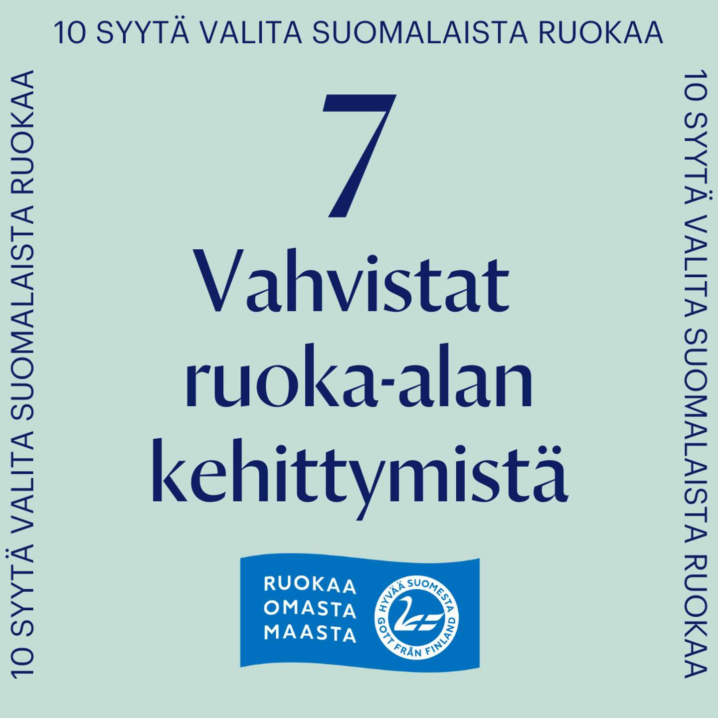 Maailman paras ruokaturva, ruoka-alan työllistävyys sekä ruoan turvallisuus ja puhtaus ovat tutkimuksen mukaan suomalaisten mielestä tärkeimpiä syitä suomalaisen ruoan valintaan. Ruoantuotannon ulkoistaminen muualle ei ole järkevää tai vastuullista toimintaa. Oli kyseessä sitten ruokaturva, eläinten hyvinvointi, ympäristöasiat tai työllisyys, voimme vaikuttaa asioihin, jos meillä säilyy oma elinvoimainen ruokaketju pellolta pöytään.