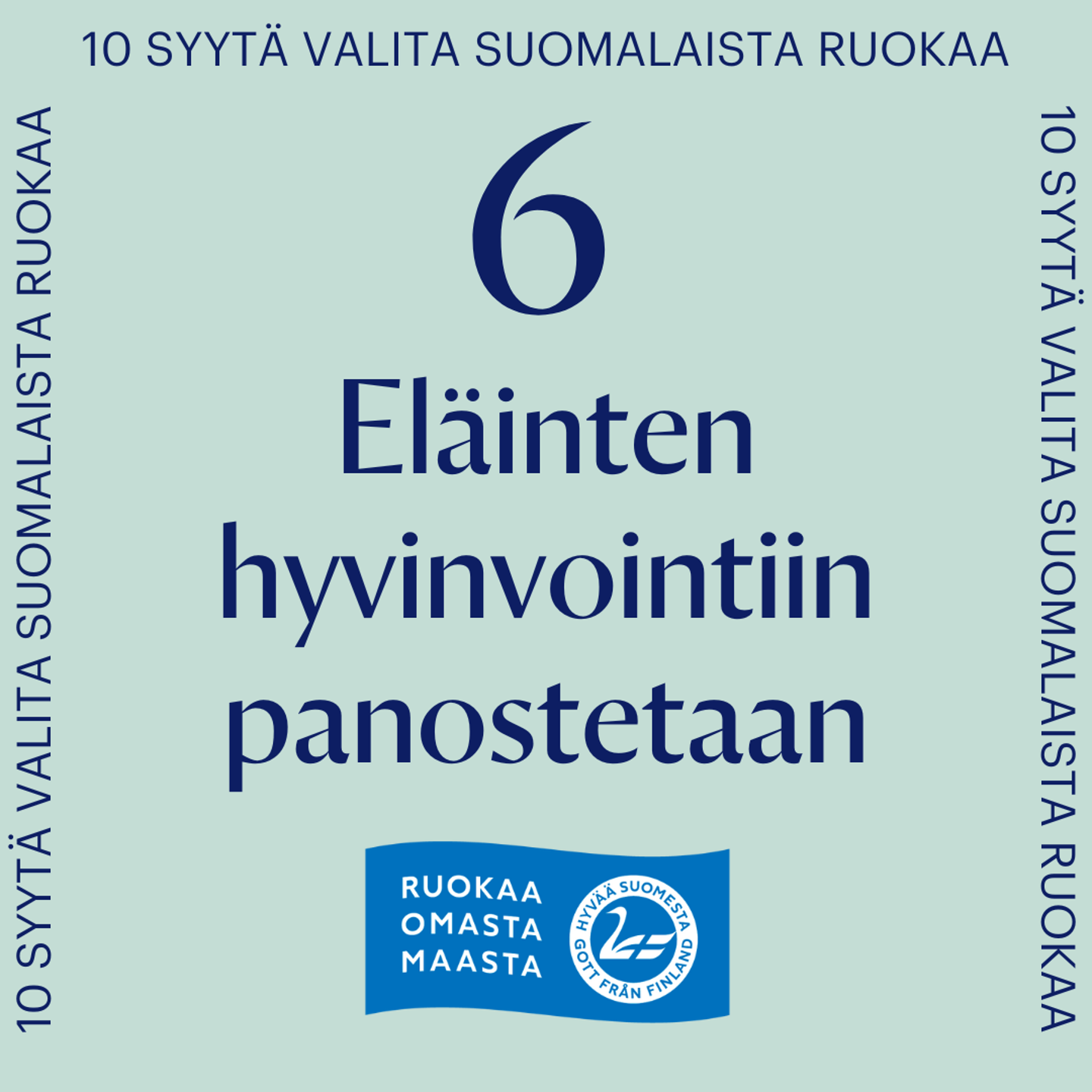 Suomalaiset maataloustuottajat ovat koulutettuja ammattilaisia, joille eläinten hyvinvointi on paitsi sydämen asia myös toimeentulon edellytys. Elinkeinon itsensä määrittelemät hyvät toimintatavat sekä lakisääteisen tason osin ylittävät tuotantoeläinten terveyttä edistävät järjestelmät tukevat tilojen päivittäistä työtä. Esimerkiksi sikojen hyvinvoinnista kertovat terveet saparot ja broilereiden osalta terveet jalkapohjat ja typistämättömät nokat. Suomalaisista lehmistä 75 % elää pihattonavetoissa, joissa ne voivat liikkua vapaasti, sekä syödä ja käydä lypsyllä halutessaan.