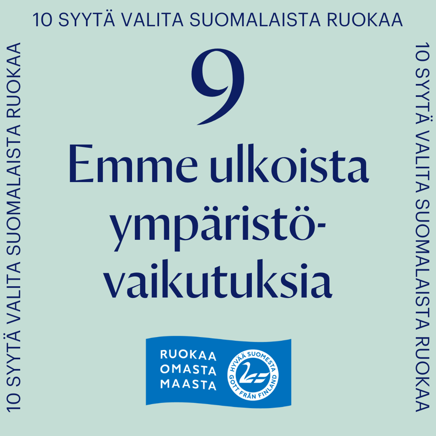 Huolehtimalla ruoantuotannon vaikutuksista Suomessa, emme käytä hyväksi muiden maiden luonnonvaroja. Valtaosa suomalaisten syömän ruoan monimuotoisuutta heikentävistä vaikutuksista kohdistuu Suomen ulkopuolelle, sillä monet ruokaketjussa käytetyt tuotteet tuodaan muualta. Kun ruoantuotanto on omissa käsissämme, kannamme vastuun mahdollisista haitoista, emmekä ulkoista ongelmia muualle, missä niitä ei välttämättä pystytä, osata tai haluta hoitaa. Ruoantuotanto vaatii paljon vettä ja maapinta-alaa, joita kumpaakin löytyy Suomesta runsaasti. Meillä on erinomaiset vesivarat, ja valitsemalla suomalaisia elintarvikkeita emme pahenna vesipulaa niissä maissa, joissa tilanne puhtaan veden suhteen on kriittinen. Esimerkiksi espanjalaisen tomaatin vesijalanjälki 91-kertainen Suomeen
