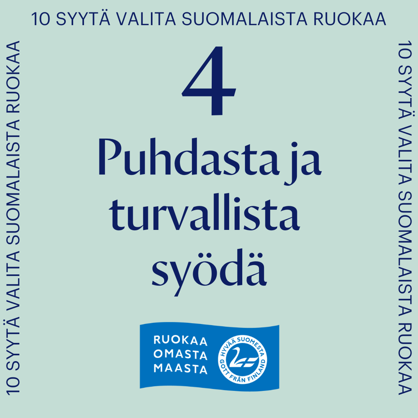 Suomalaisen ruoan puhtauden perusta ovat maamme puhdas vesi, ilma ja maaperä. Turvallisen ruoan avain on kuitenkin ruokaketjun ammattilaisten osaaminen ja tinkimätön työ. Tästä osoituksena esimerkiksi salmonella ja monet eläinten sairaudet on saatu kitkettyä ruokaketjussamme lähes olemattomiin. Eläimiä ei myöskään lääkitä